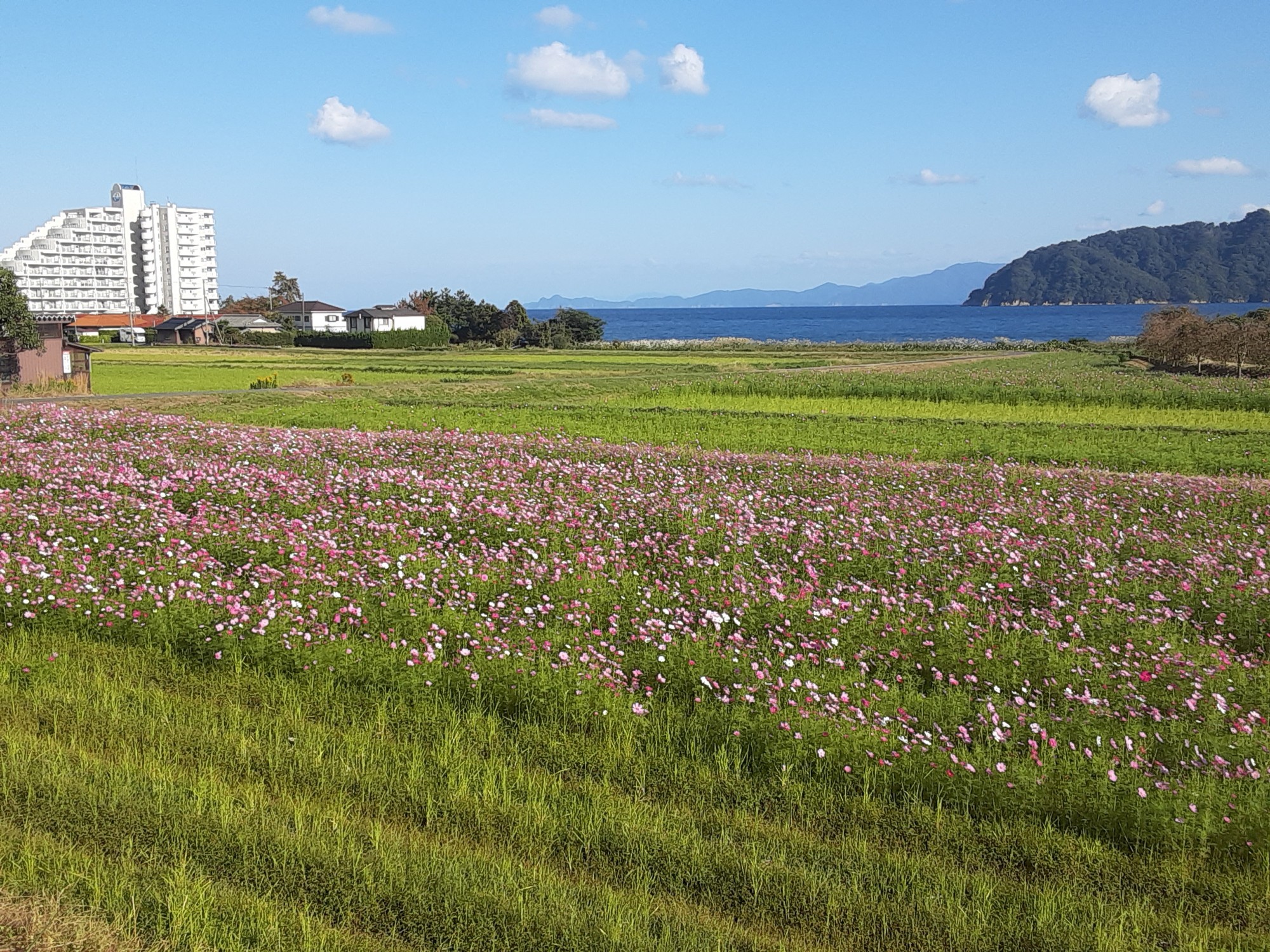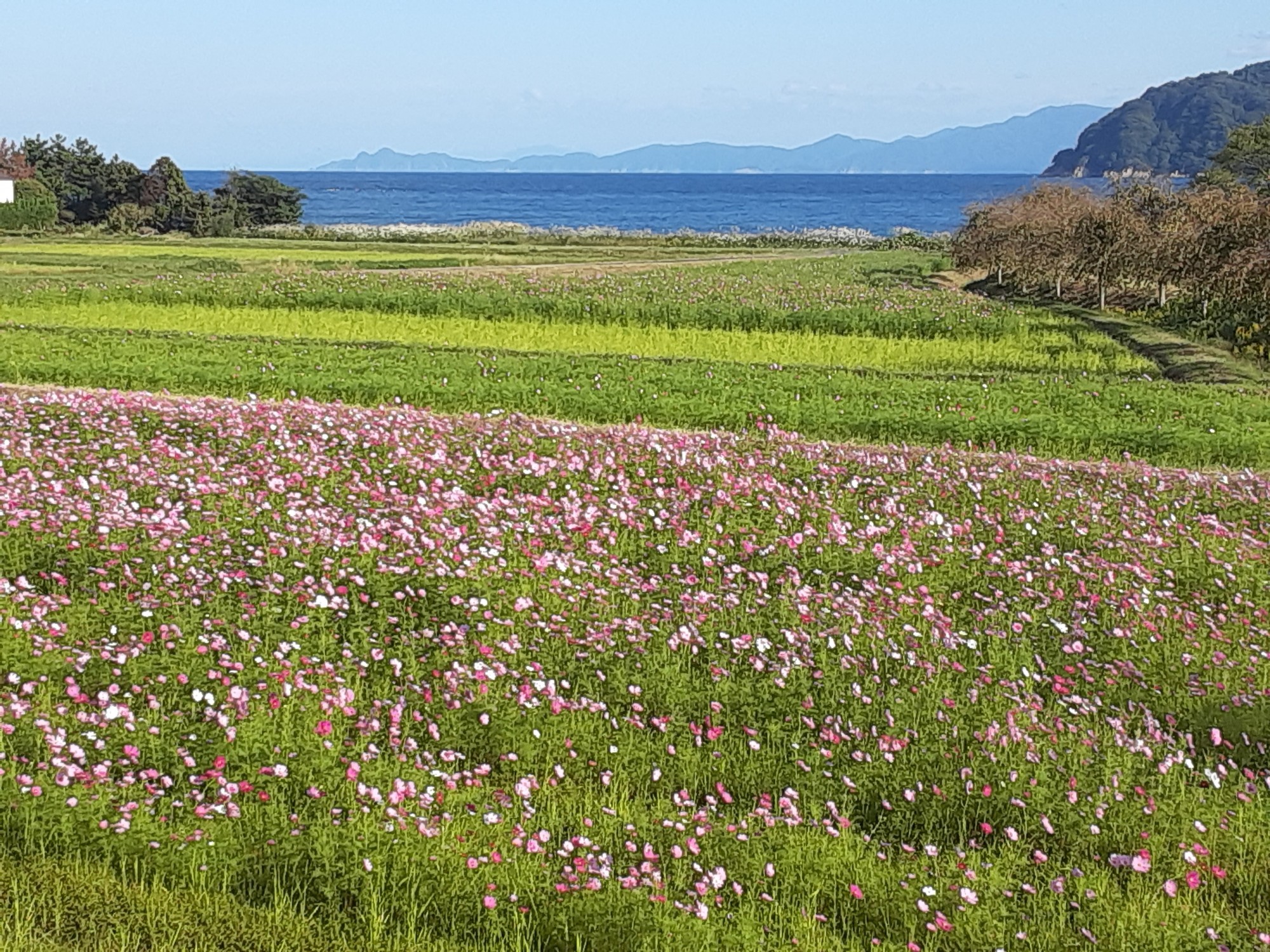 ⑯いま、宮津の日置ではコスモスと宮津湾とのコントラスト、とてもいいですよ